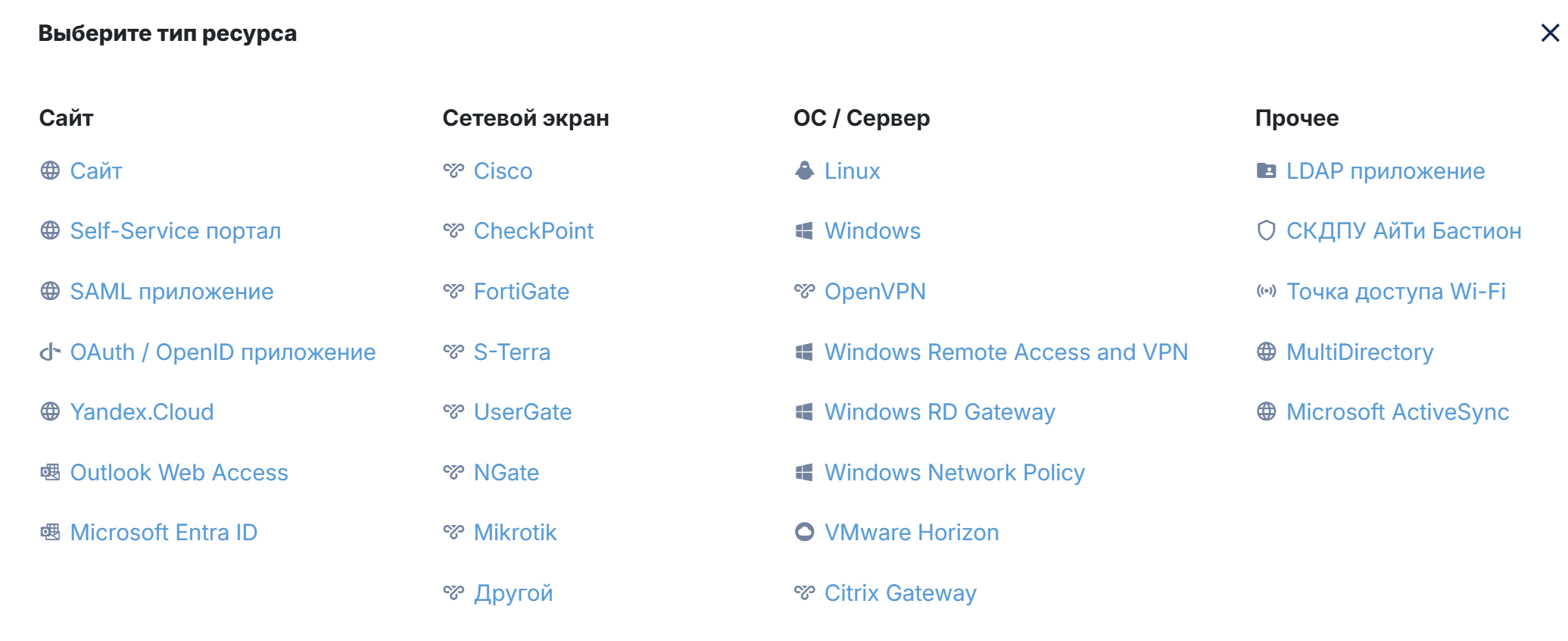 Для добавления доступны ресурсы 4-х типов: «Сайт», «Сетевой экран», «ОС/Сервер» и «Прочее».