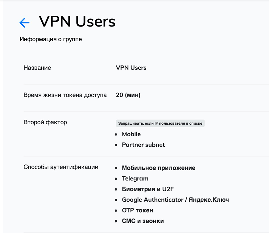 - Support 2: доступ к разделам «Пользователи» и «Запросы доступа» с возможностью отправки ссылки на настройку второго фактора и отключения способов аутентификации пользователя;