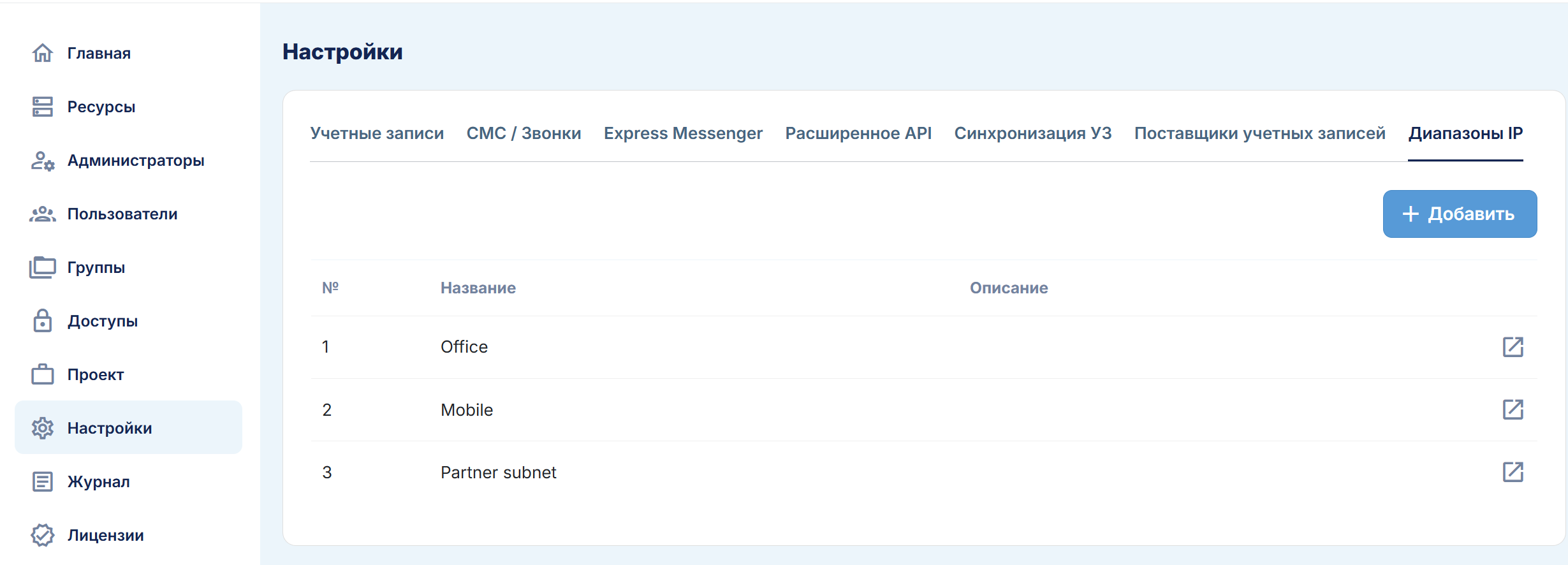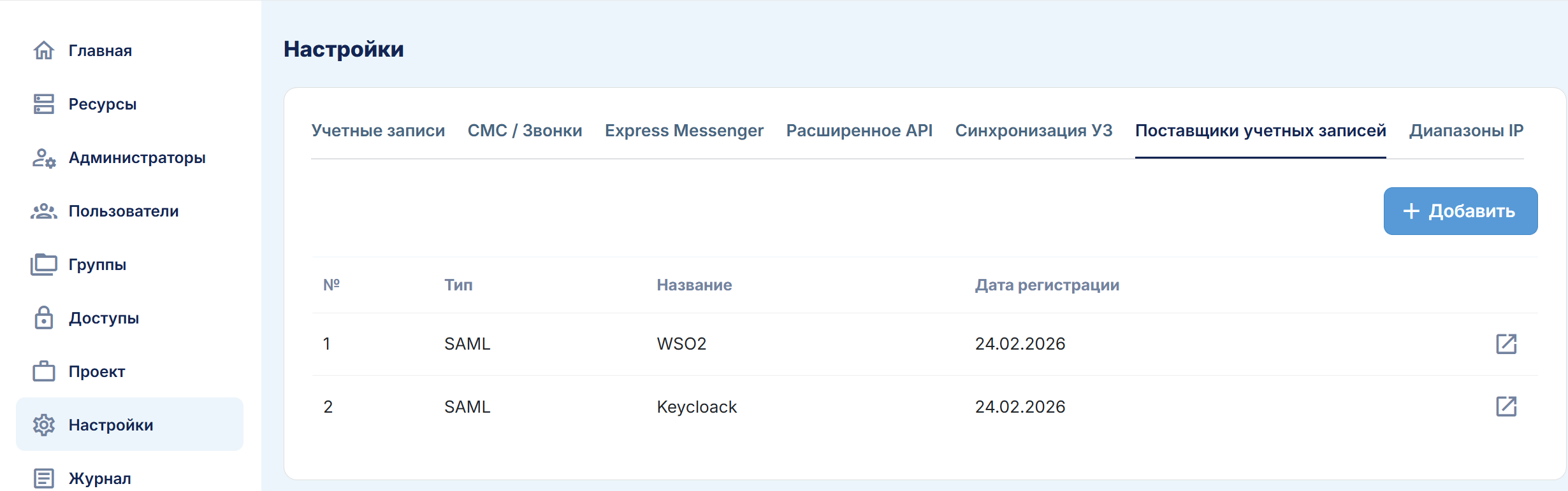 Вы можете добавить необходимый вам тип ресурса, а в разделе настроек просмотреть данные для аутентификации и отредактировать название или адрес ресурса.