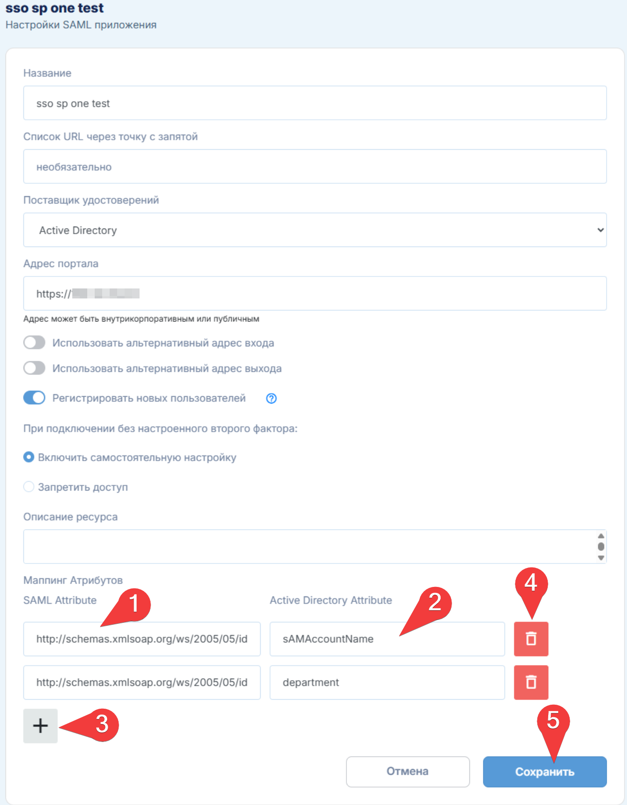 Далее укажите ресурс, созданный Вами ранее ( SAML, OAuth / OpenID приложением), после чего заполните следующие параметры: