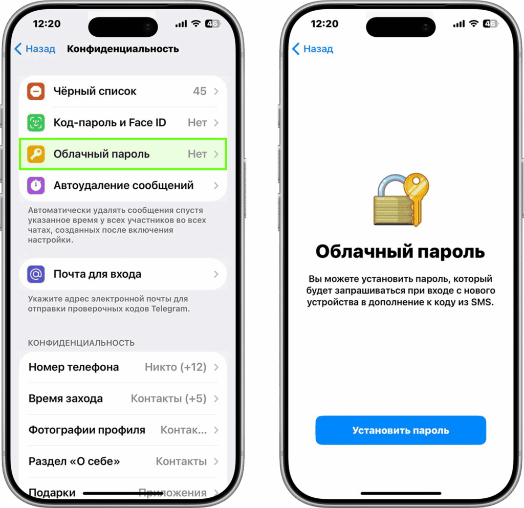 Опция расположена в разделе настроек конфиденциальности и безопасности вашего аккаунта. Просто откройте профиль, зайдите в «Настройки» → «Конфиденциальность» (на английском языке этот раздел называется «Privacy and Security», то есть «Конфиденциальность и безопасность») → найдите и выберите пункт «Облачный пароль», если же у вас установлен английский язык, то нужный вам пункт будет называться «Two-Step Verification» (Двухэтапная проверка).